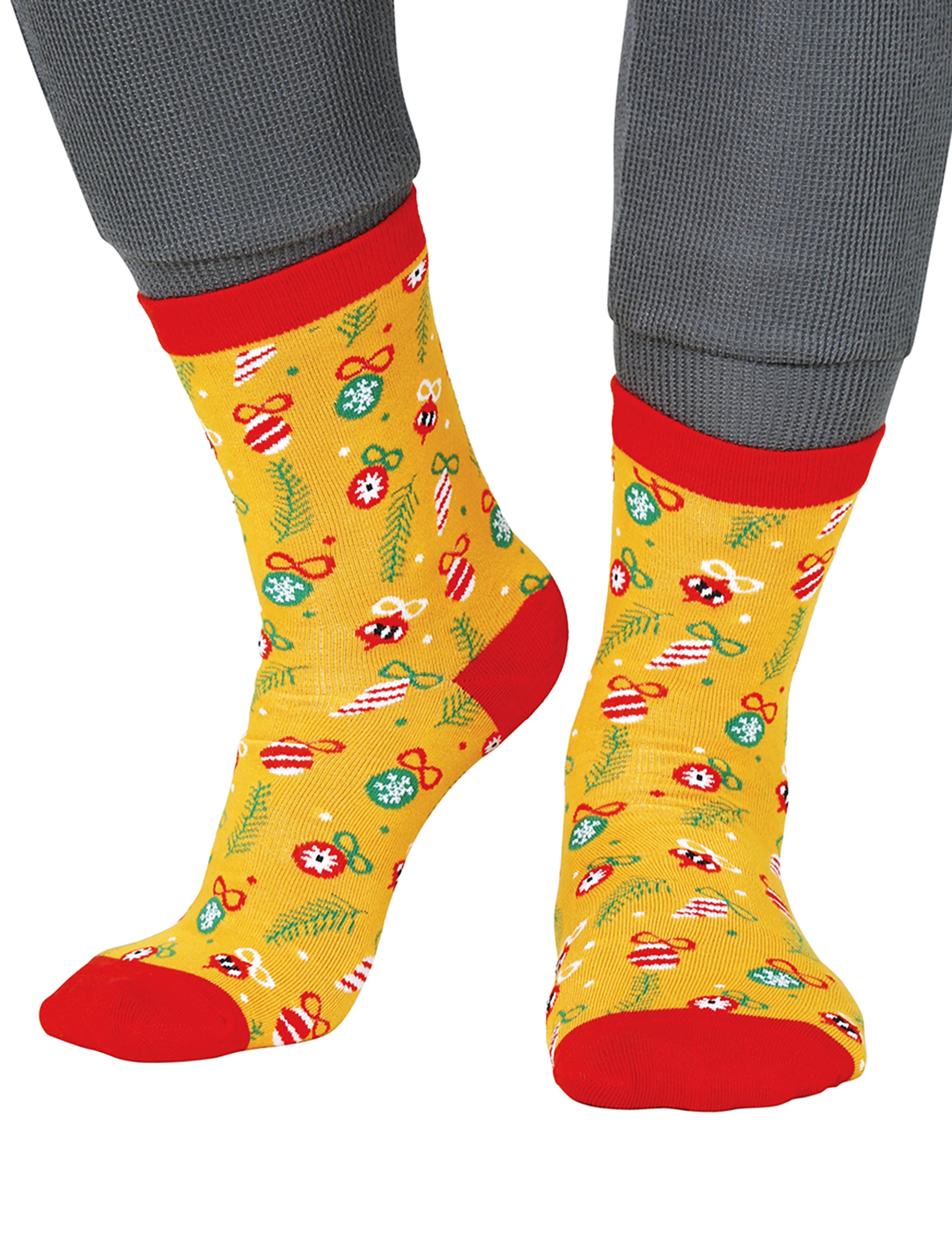 Тези шарени жълти коледни чорапи за възрастни добавят искрящ щрих към вашия празничен тоалет. Коледни топки, снежинки и захарни бастунчета са изобразени на яркожълтия им фон в весела смесица от червено, зелено и бяло. Червените им краища и върхове добавят контрастна и празнична нотка, идеални за озаряване на зимните ви вечери с хумор и стил.