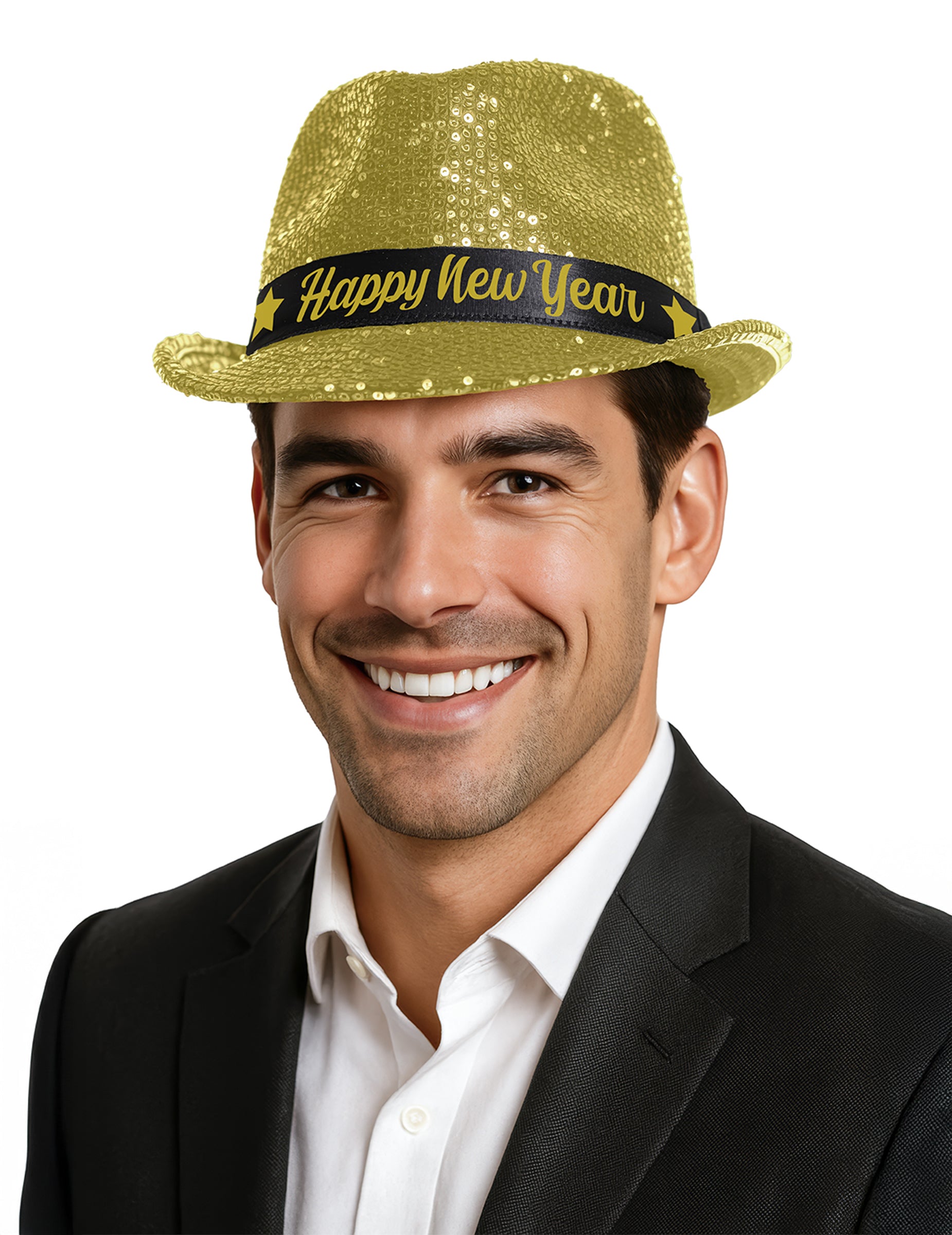 Тази златна шапка с пайети е перфектният аксесоар за стилно посрещане на Нова година. Украсена с черна панделка с надпис „Честита Нова Година“, обградена от златни звезди, тя със сигурност ще привлече вниманието и мигновено ще добави празничен щрих към облеклото ви. Лека и искряща, тя се съчетава перфектно с елегантен ансамбъл, за да отпразнувате Нова година в ослепителна атмосфера.