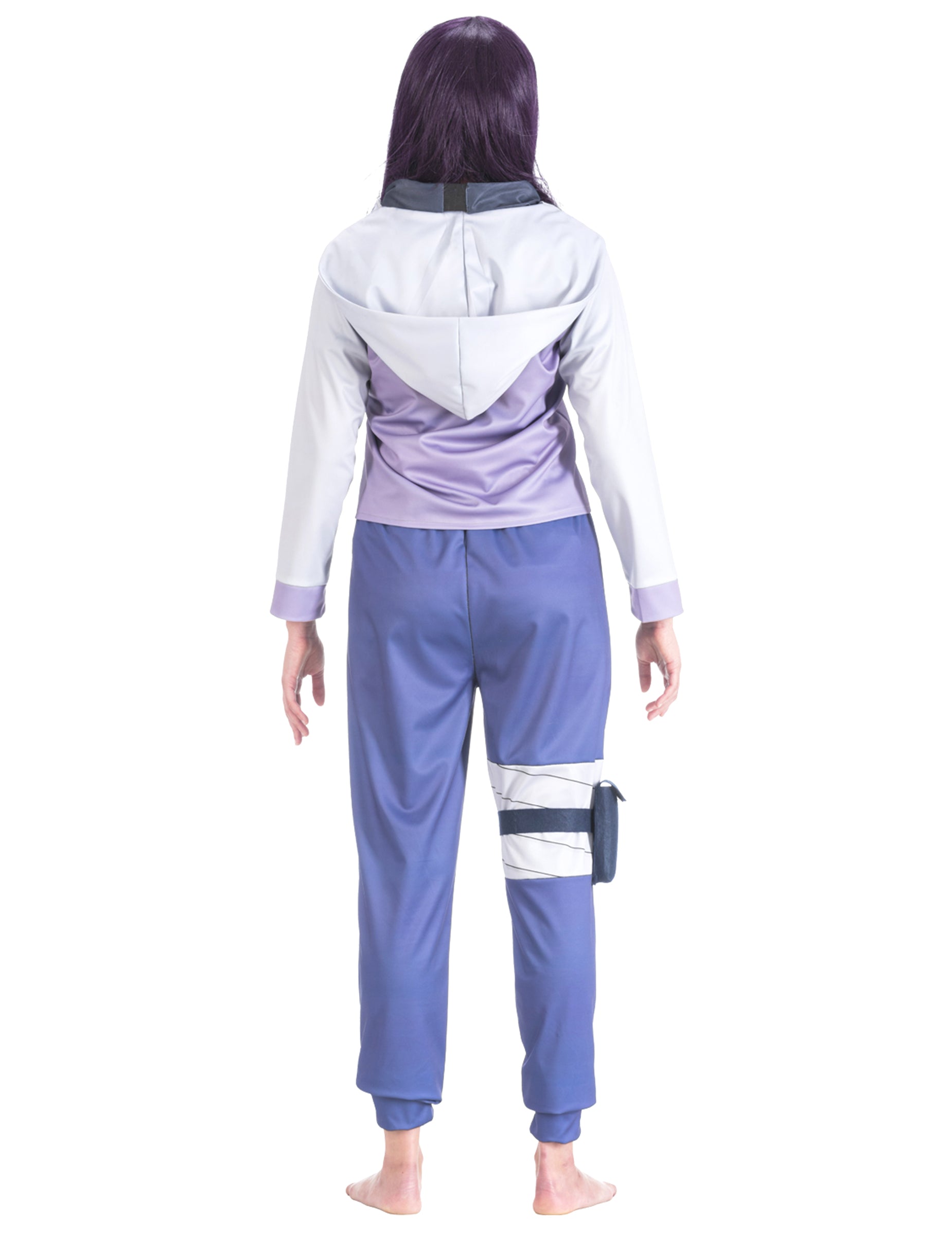 Този дамски костюм на Хината Наруто включва лилаво яке, тъмен топ, сини панталони, чокър и торбичка - пет части, които перфектно улавят визията на героя. Якето е в нежно лилаво със светли ръкави, докато тъмният топ създава семпъл контраст. Сините панталони имат удобна права кройка. Огърлицата включва добре познатия символ на селото, а торбичката се носи отстрани, за да подчертае стила на Хината. Перфектен костюм за тематично парти, карнавал или рожден ден.
