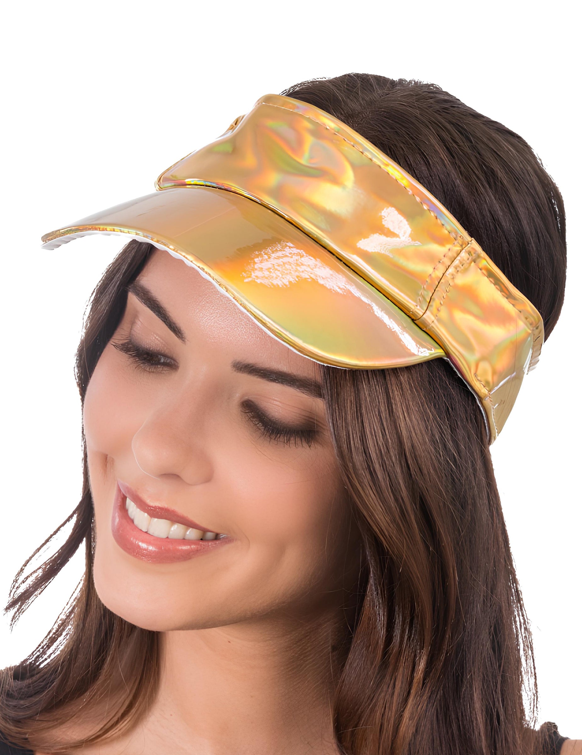 Тази златиста ирисираща се визьорка за възрастни придава блестящ отблясък и перфектен блясък, за да се откроите. Нейният златен цвят с променящи се ефекти осигурява празничен стил, идеален за фестивали, летни партита и момински партита. Визьорката предпазва очите от слънцето, като същевременно оставя горната част на главата открита, което позволява да се чувствате комфортно през цялото празненство. Един семпъл и практичен аксесоар за допълване на цветен парти тоалет по време на весело събиране.