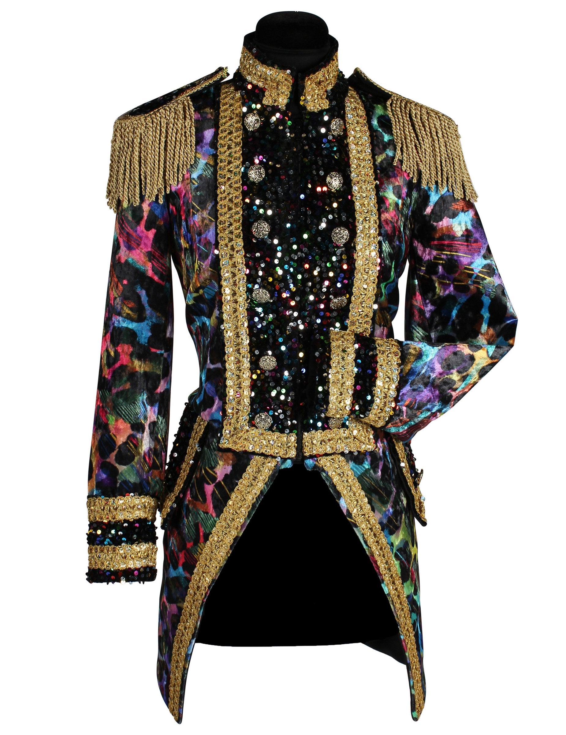 Този дамски карнавален сако от висок клас в неонови цветове се отличава с ярките си нюанси и златисти декорации, които подчертават цялата фигура. Фринговите еполети акцентират върху горната част на облеклото, а блестящите ленти и цветните мотиви засилват празничния му вид. Крайният резултат придава енергичен и изразителен стил, идеален за оживяване на всяко парти облекло.