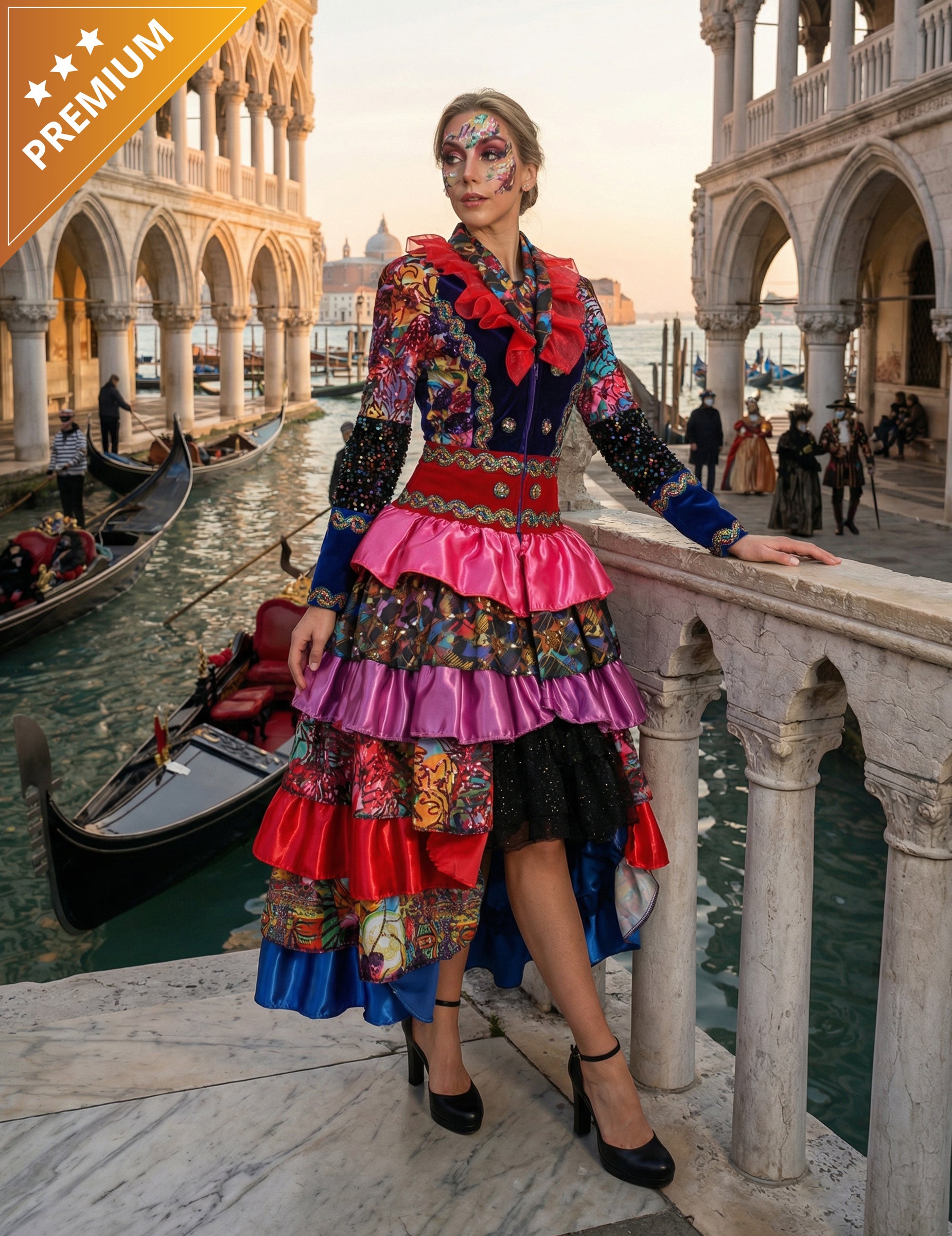 Това първокласно, многоцветно дамско карнавално яке в стил Fiesta Carnavale се откроява с ярките си нюанси и привличащи вниманието празнични шарки. Украсените ръкави, ясно очертаната яка и контрастните кантове създават динамична визия, а многоцветните детайли добавят радостен и характерен щрих. Дизайнът ласкае фигурата и е силно изразително, идеално за парти облекло. Идеално за карнавални или костюмирани партита, то перфектно допълва визия, която цели да направи смело изявление.