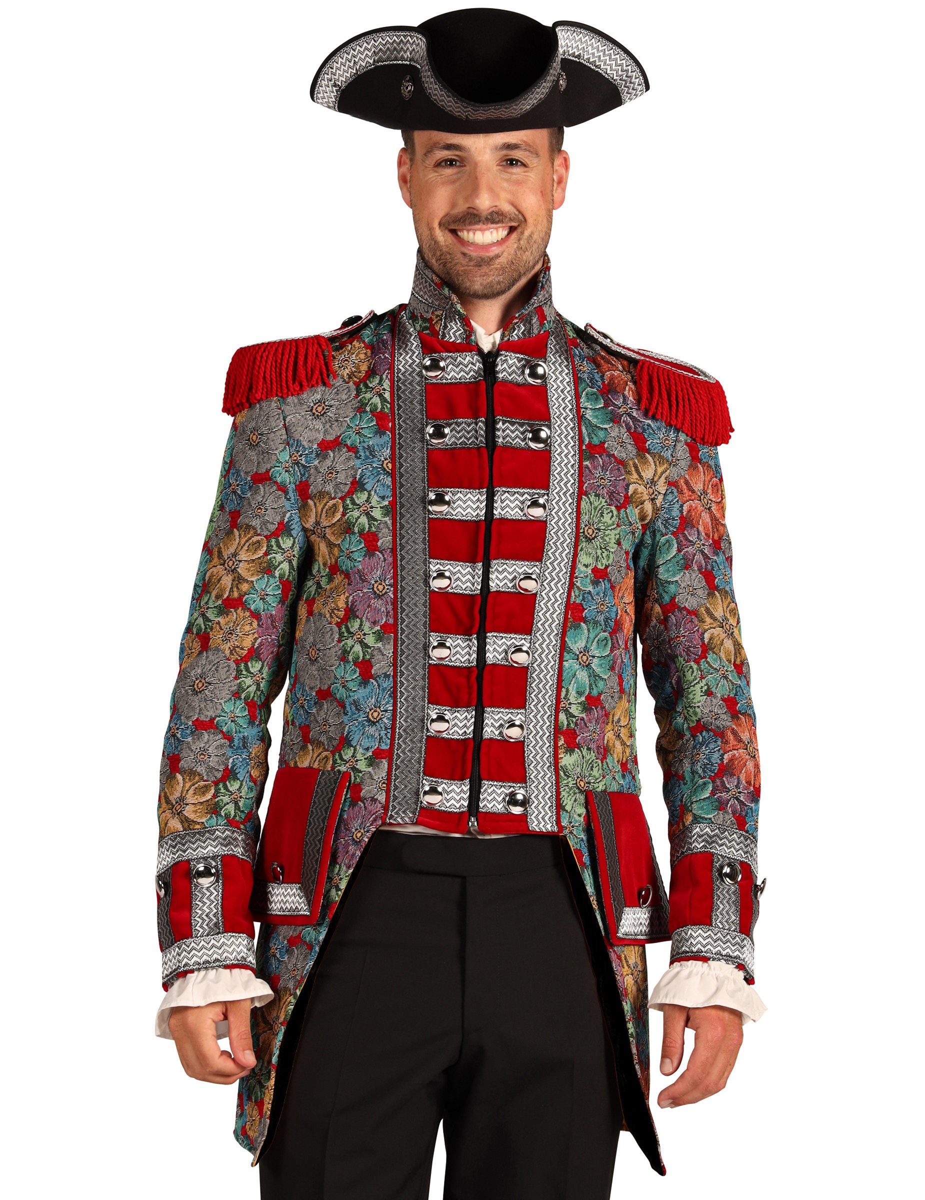 Това първокласно мъжко карнавално яке с флорален принт се отличава с богата визуална привлекателност, благодарение на ярките си цветове и сложните си флорални шарки. Червените еполети създават структуриран силует, а декоративните детайли подчертават елегантния му вид. Контрастните райета подчертават формата на палтото и добавят нотка на изтънченост към всяко движение. Идеално за карнавални или костюмирани партита, то стилно допълва всяко облекло, което се стреми да се открои.