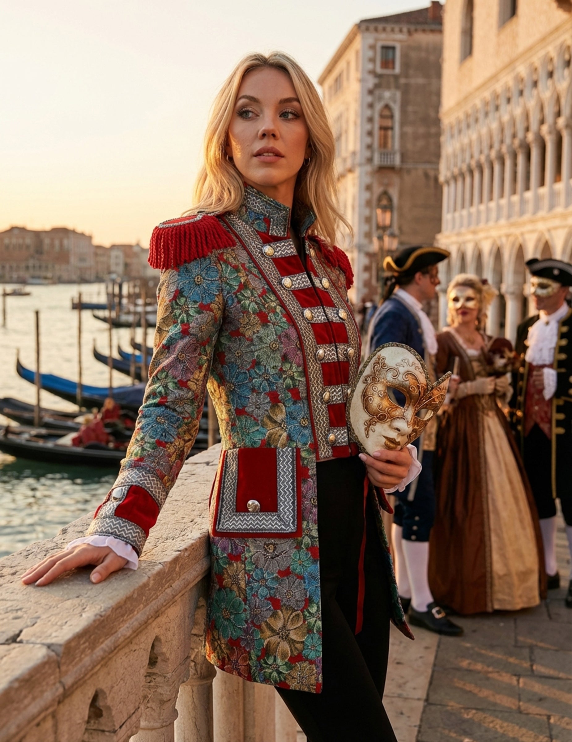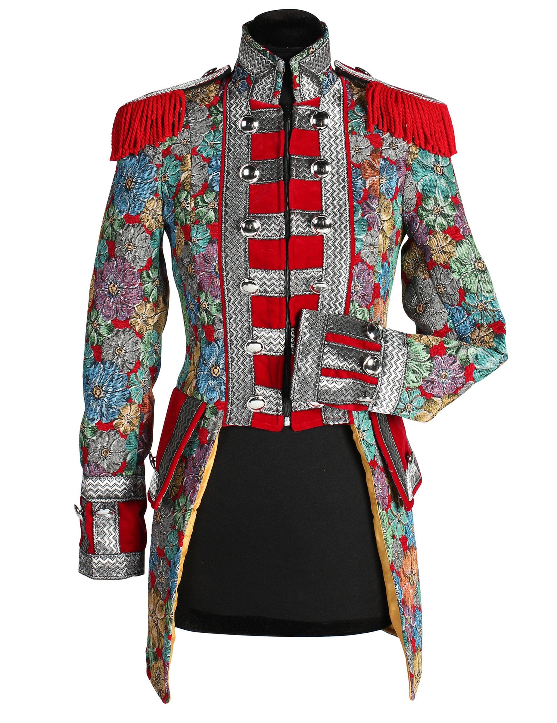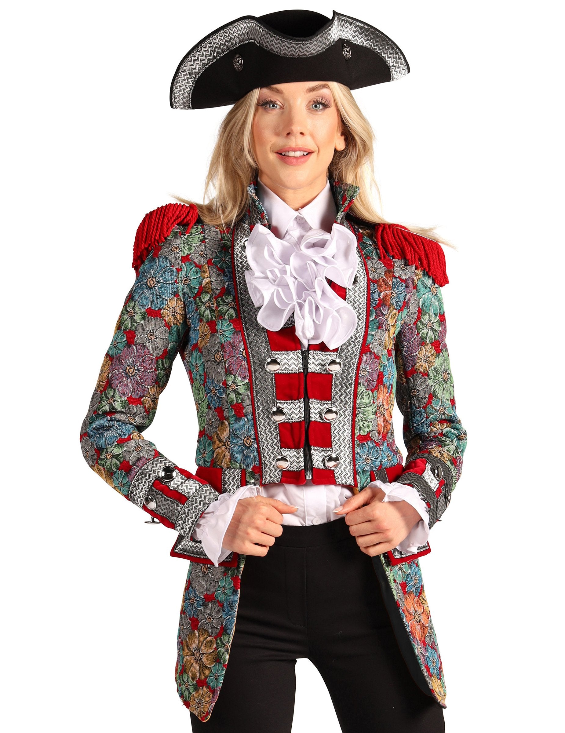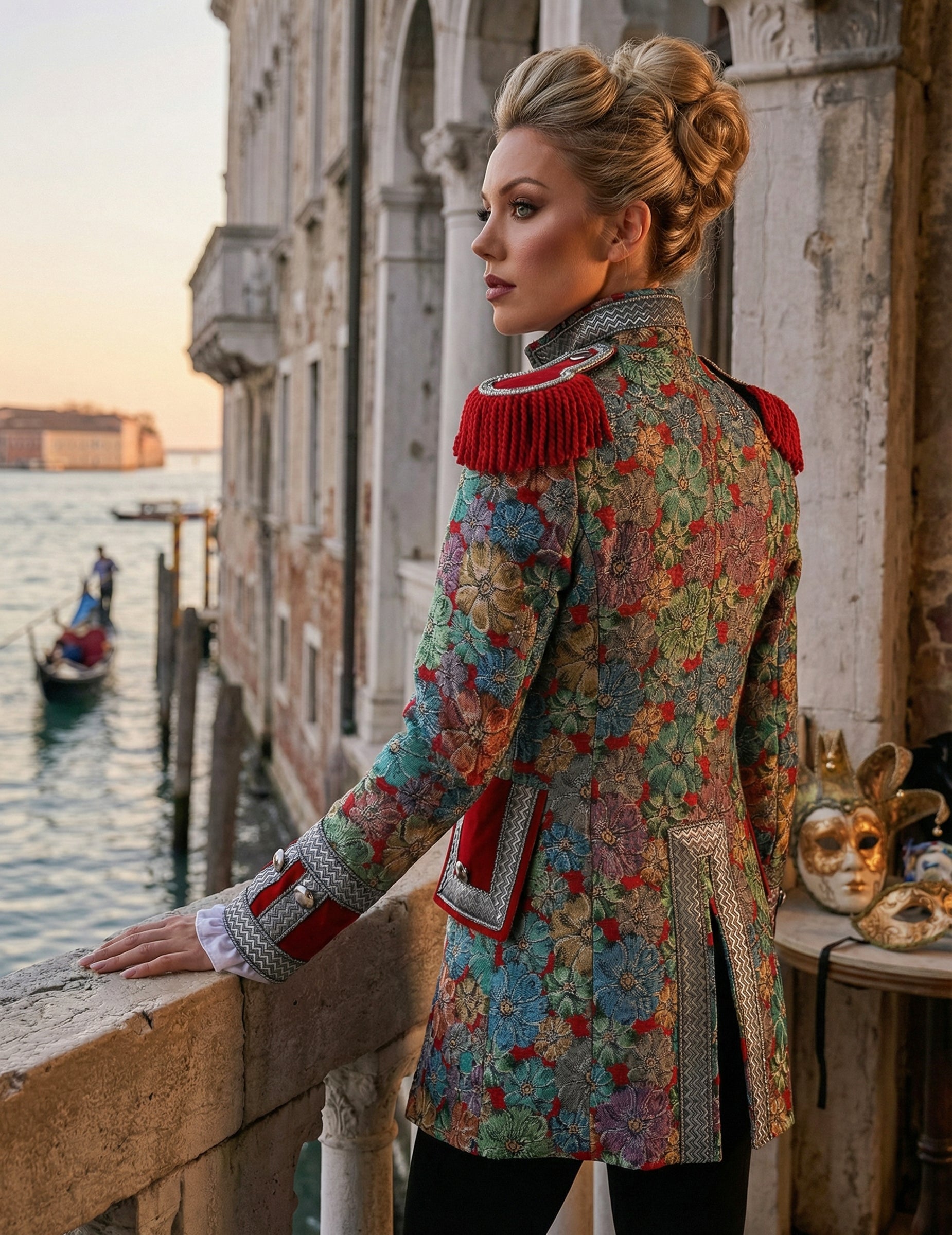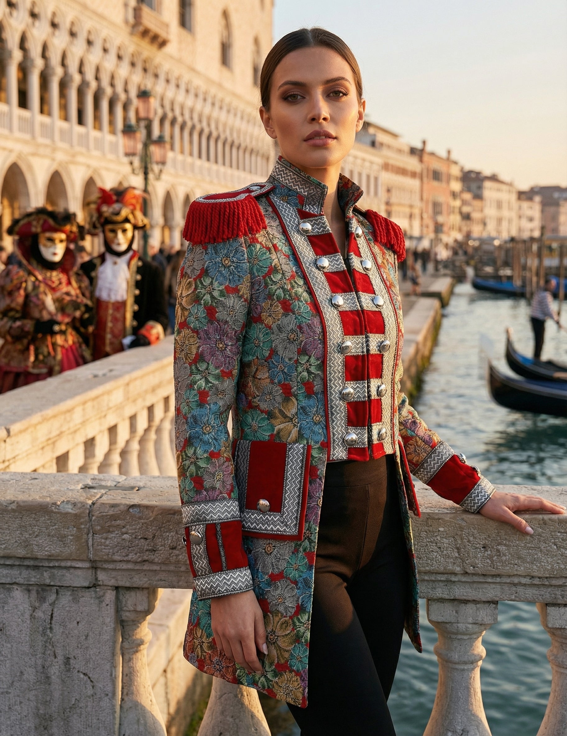 Този дамски карнавален жакет с флорални мотиви от висок клас се отличава с ярките си цветове и декоративни мотиви, които веднага привличат вниманието. Елегантната му кройка подчертава раменете благодарение на червените орнаменти, докато флоралните детайли придават изтънчен акцент. Контрастът между завършващите елементи и декоративните ленти създава хармонична и характерна визия, подходяща за празнично облекло.
