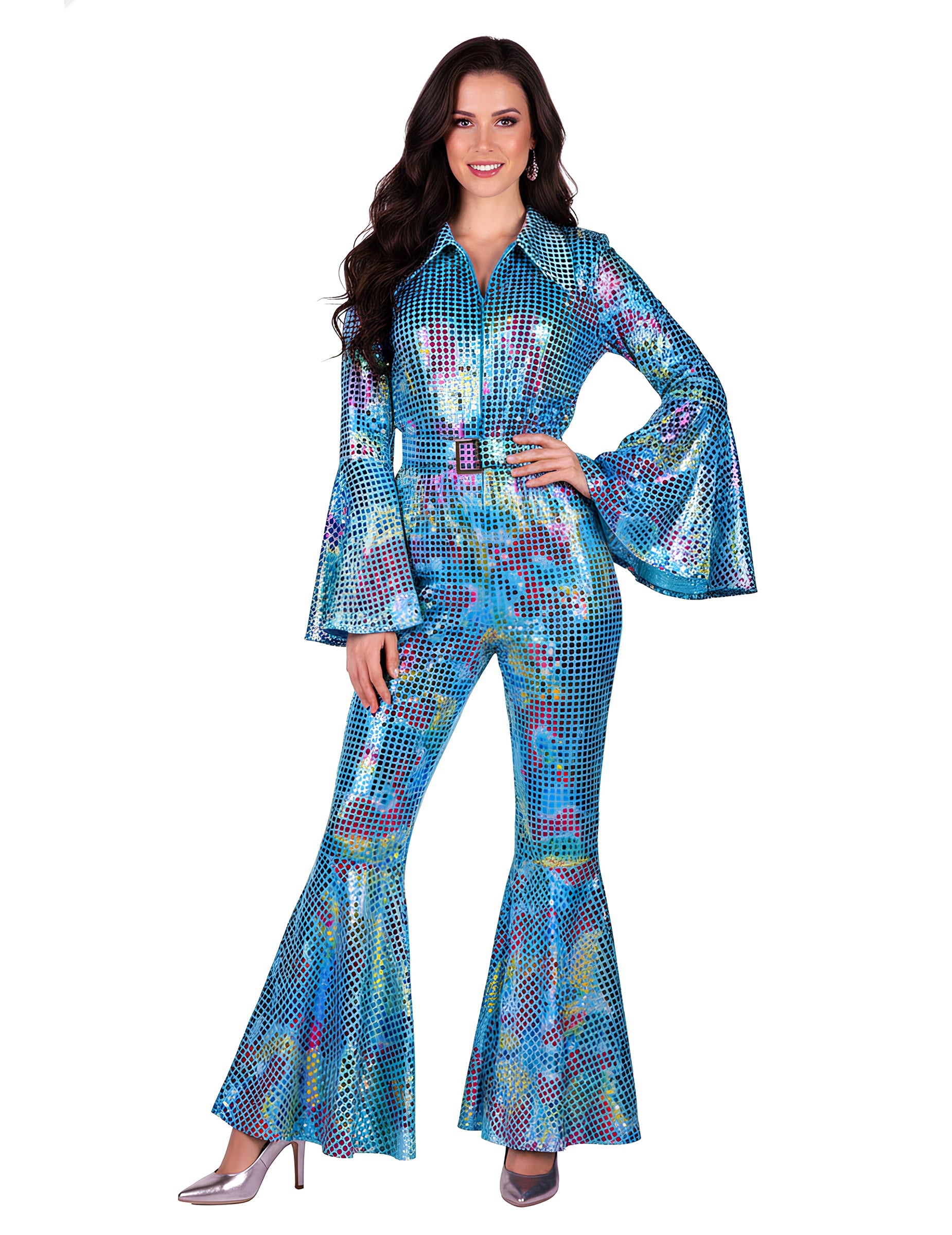Този висококачествен дамски диско гащеризон в тюркоазено веднага привлича вниманието с блестящия си ефект и яркия цвят – идеален за празнуване на Нова година.
