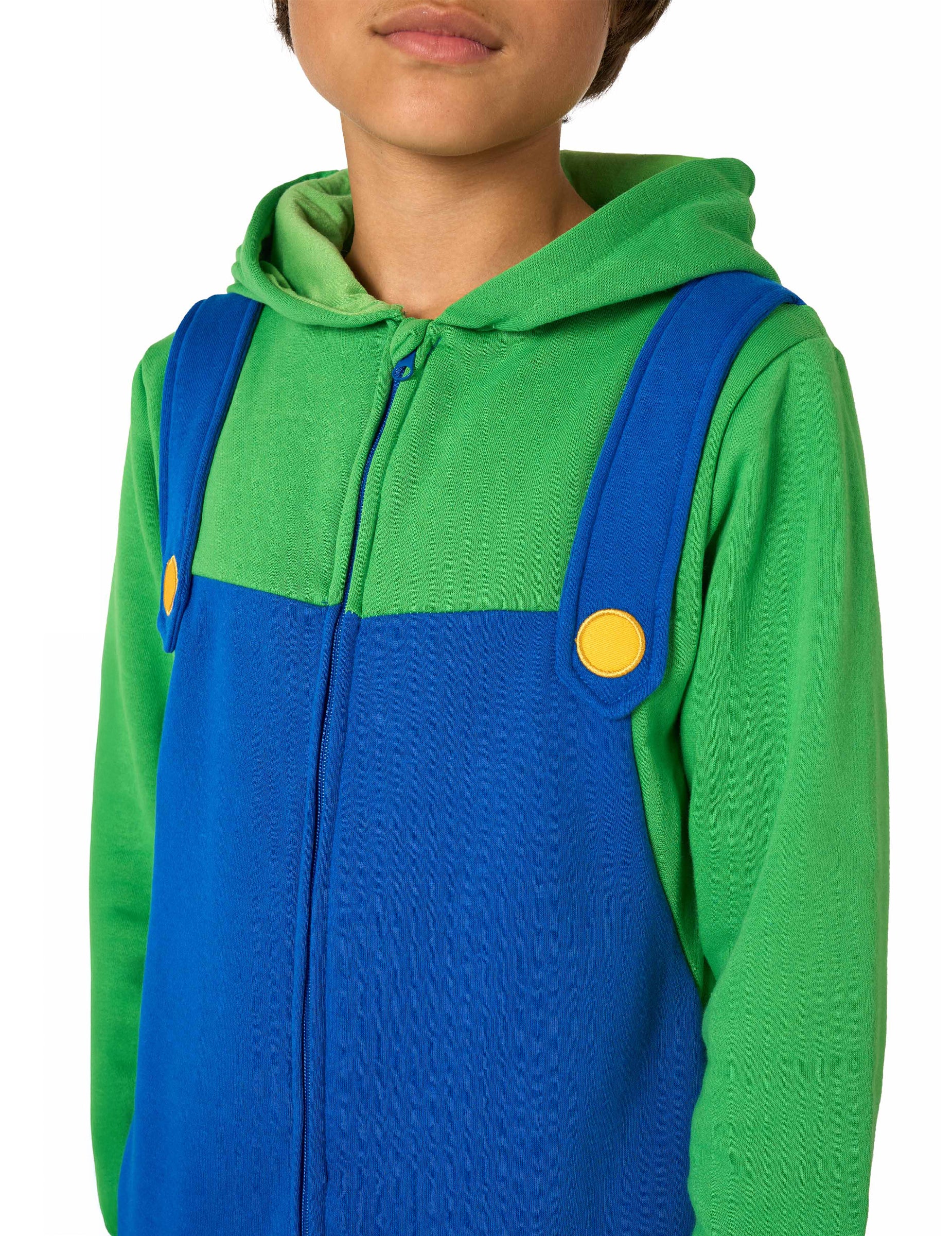 Този детски гащеризон Luigi съчетава зелен горнище с качулка с голямо "L" и синьо долнище, напомнящо за гащеризона на героя. Принтираните презрамки и жълтите точки добавят визуален детайл, който веднага напомня за известния брат на мустакатия герой. Свободната му кройка позволява лесно движение и плавно, удобно усещане, идеално за носене през целия ден. Предният цип улеснява обличането на гащеризона, като същевременно запазва безшевния вид на костюма. Веднъж облечен, той предлага наистина отличителен стил, с живи цветове и характерните за Luigi мотиви. Този гащеризон Luigi е идеален за добавяне на нотка забавление с видеоигри към рожден ден, карнавал или друг празничен повод, посветен на героите от Гъбеното кралство.