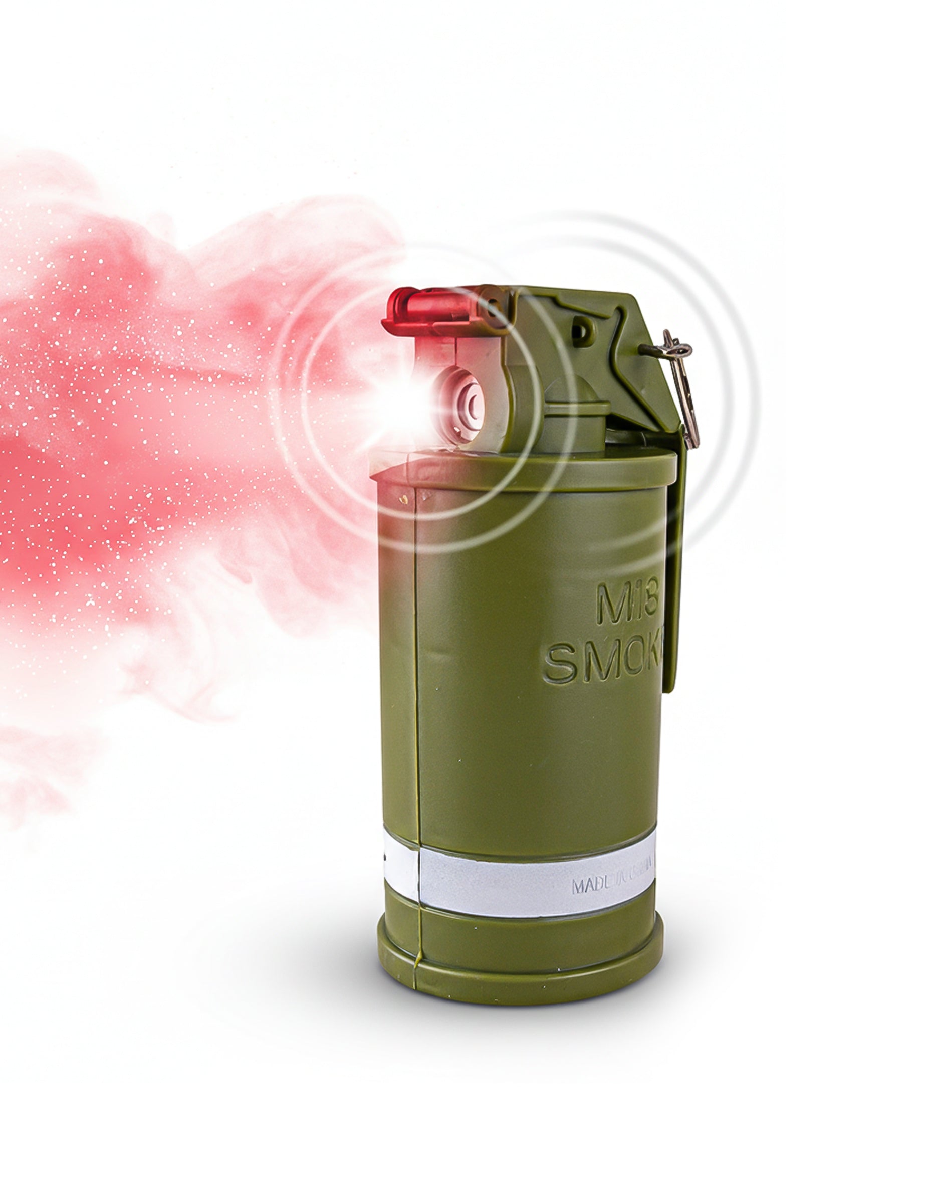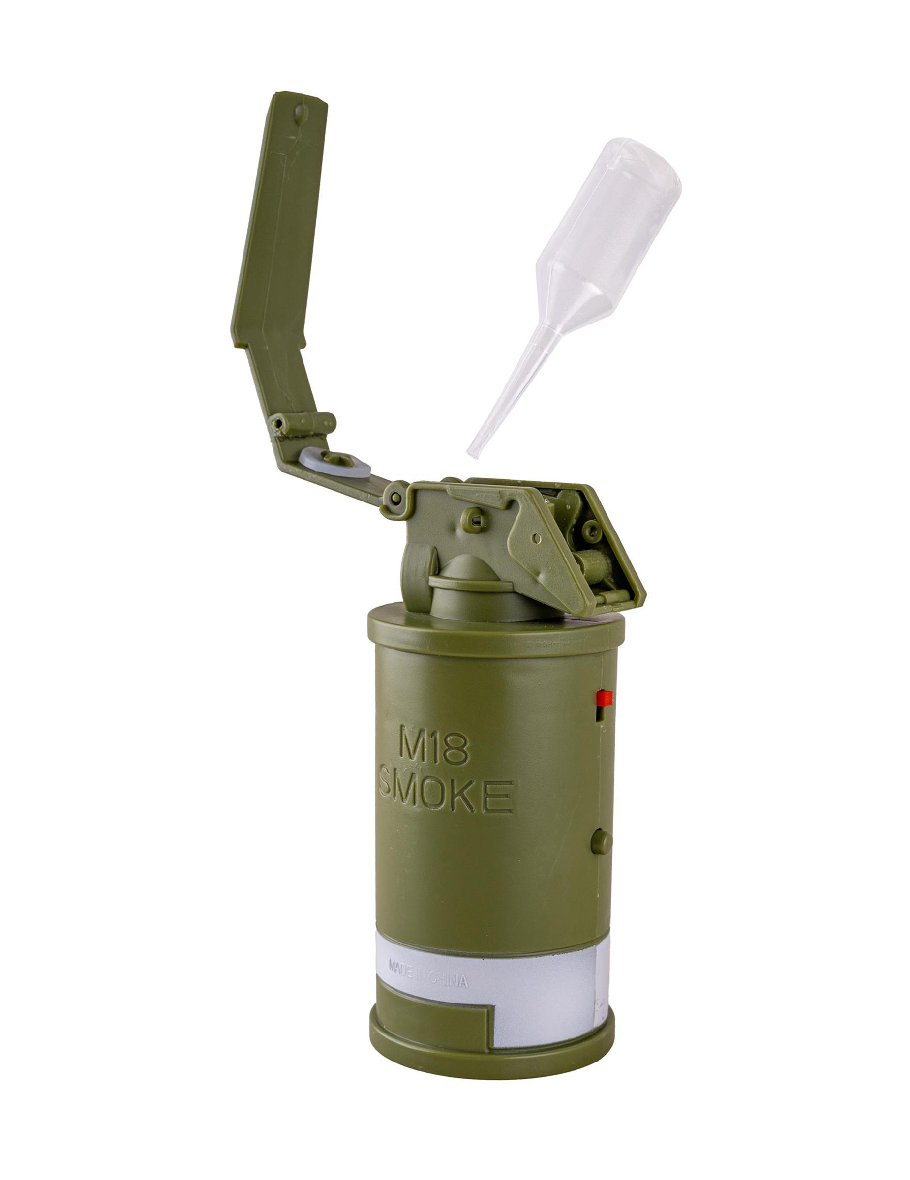 Тази Фалшива граната с дим, звук и светлина има дизайн, вдъхновен от военна екипировка, със здраво зелено тяло и горен лост, който се отваря за достъп до вътрешния резервоар.