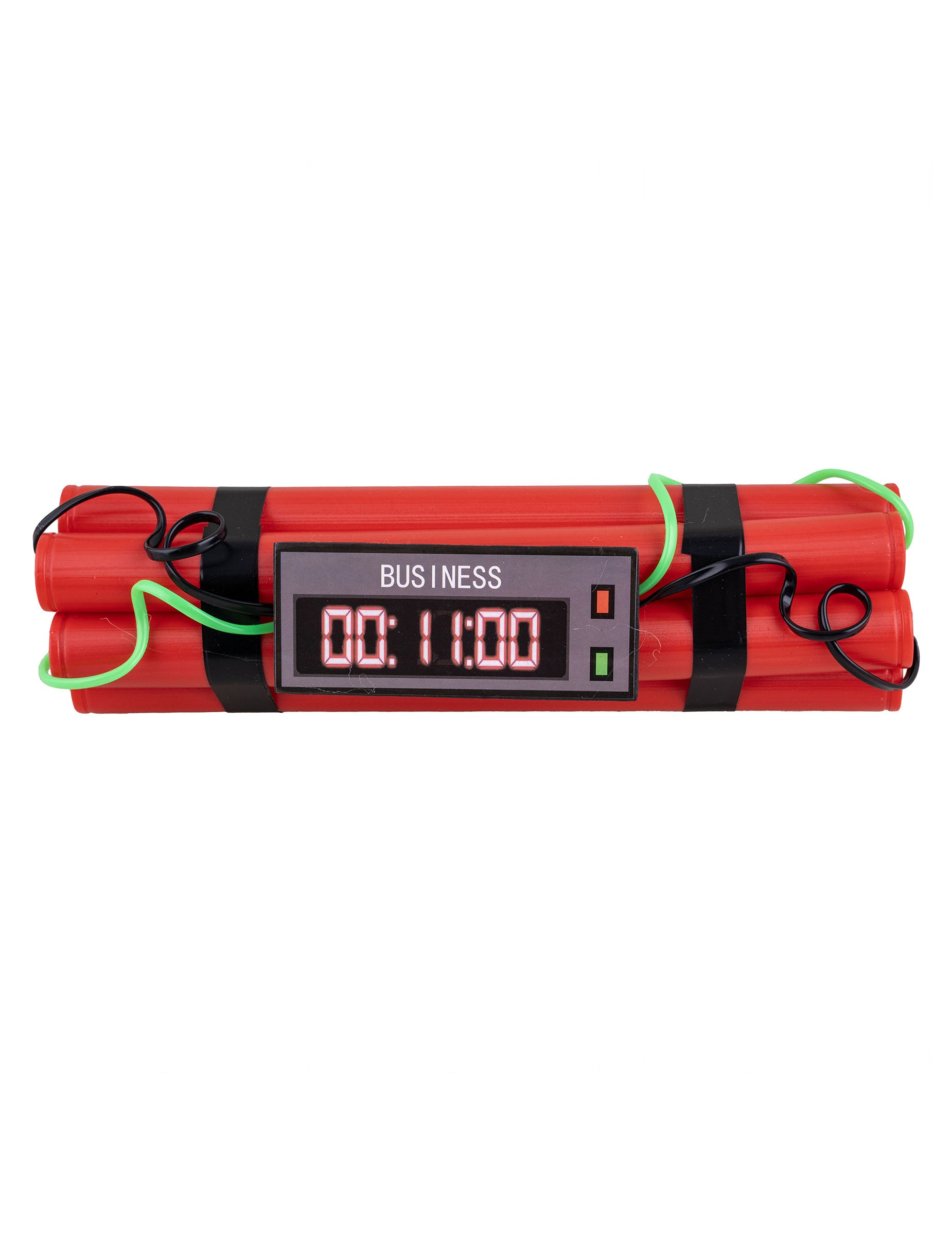 Тази Фалшива динамитна шашка с таймер е изцяло създадена да наподобява сценичен аксесоар, с трите си червени пръчки, свързани с цветни кабели и фалшив дигитален дисплей, показващ обратно броене.