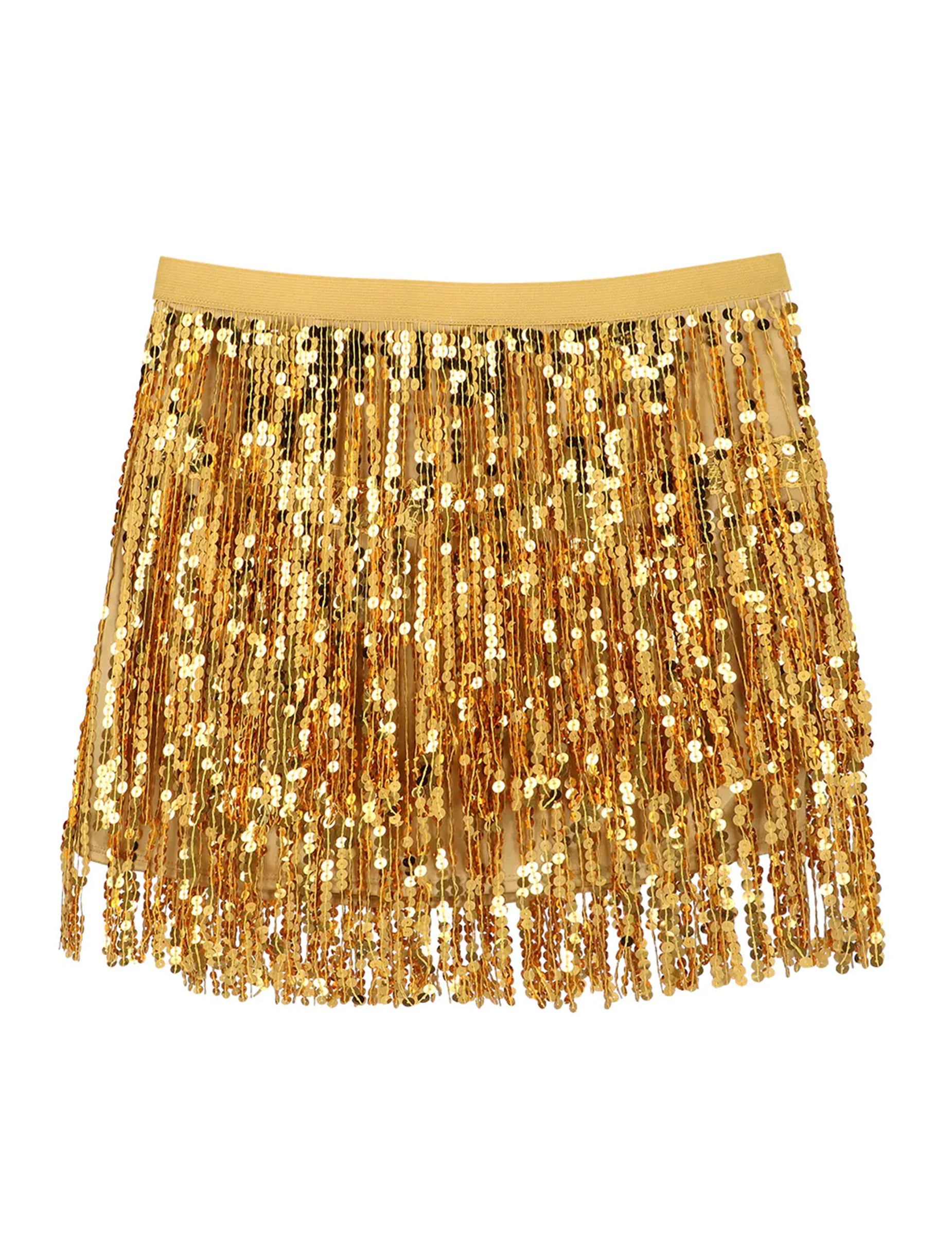 Тази златиста минипола с пайети за жени се отличава с дългите си блестящи ресни, които се движат елегантно при всяка крачка.