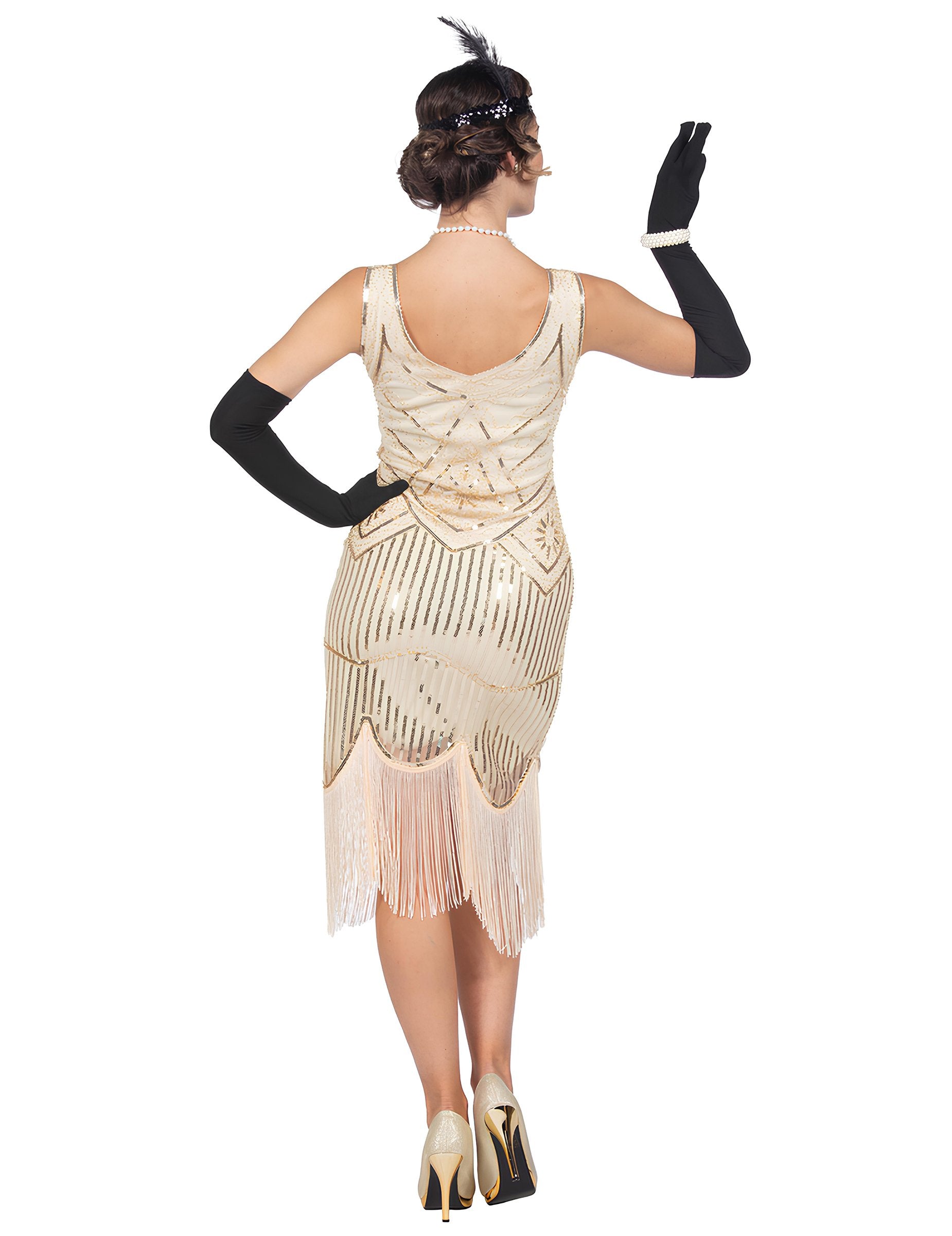 Този луксозен дамски карнавален костюм Чарлстън в бежово със сияещи пайети представя рокля, украсена с дискретни пайети, оформящи геометрични мотиви, напомнящи типичните облекла от лудите години на 20-те. Бежовата основа придава мекота, която подчертава блестящите детайли. Правата кройка е допълнена с фини ресни в долната част на роклята, създавайки приятно движение, характерно за стила Чарлстън. Редовните мотиви и изчистените линии осигуряват елегантен вид без излишества. Перфектен избор за парти в стил 20-те години, ретро тематично събитие или елегантно празненство, където тази рокля ще внесе стил, ще направи визията ви още по-приятна, хармонична и запомняща се.