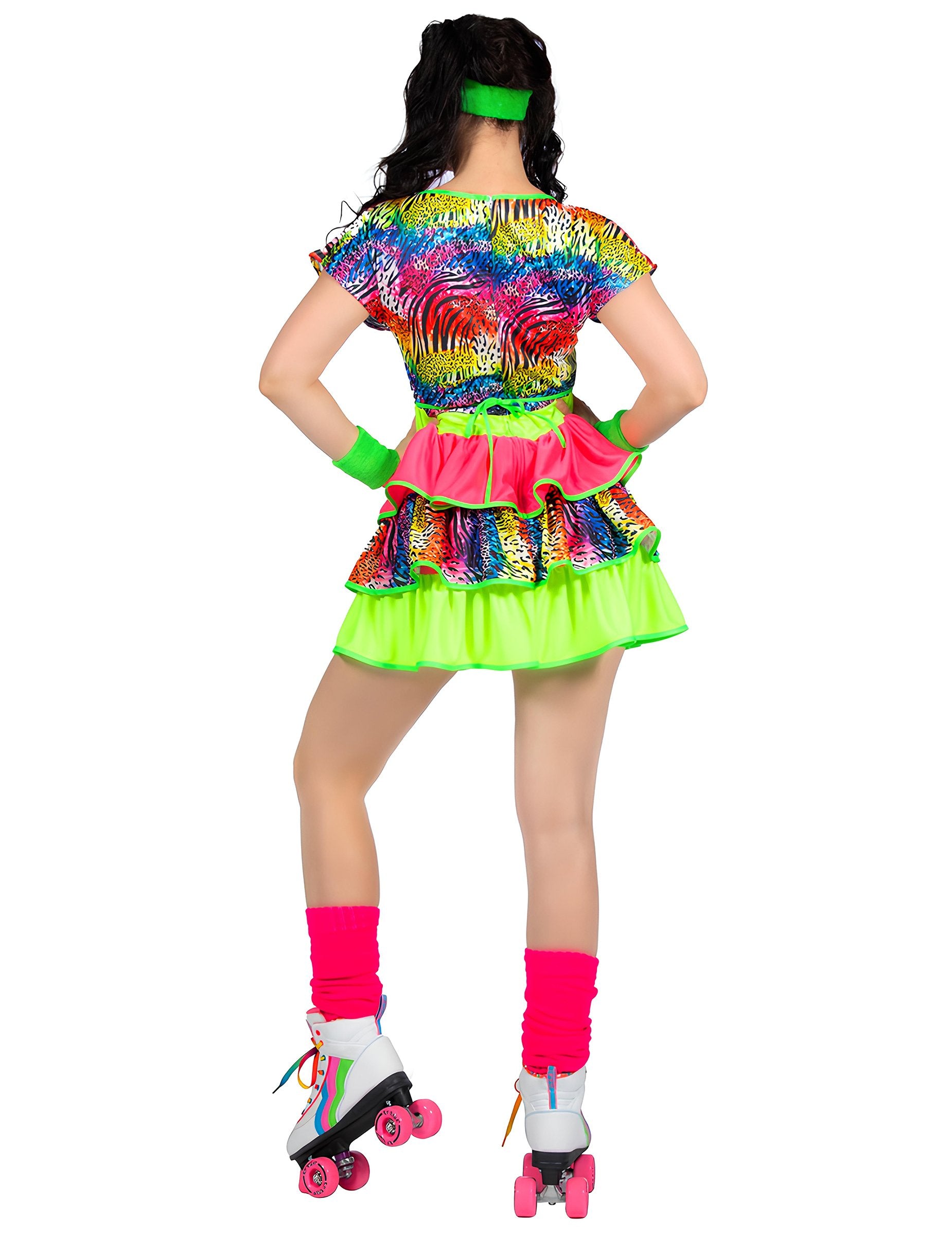 Този кичозен костюм за жени от 80-те години включва рокля в ярки цветове, съчетаваща многоцветни мотиви и неонови акценти. Късата кройка с многопластови волани напомня забавния и преувеличен стил на това цветно десетилетие. Неоновите нюанси и смесицата от мотиви придават енергичен и типично ретро вид, без да са прекалени, като същевременно осигуряват лек и забавен облик. Перфектен избор за парти с тема 80-те, карнавал или ретро събитие, където тази рокля ще внесе ярък акцент и ще направи визията ви още по-весела, динамична и приятна за носене.