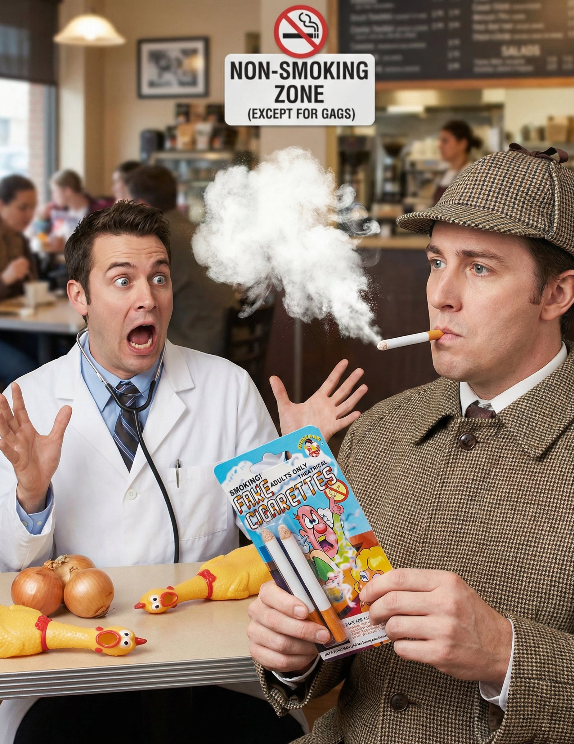 2 броя фалшиви пушещи цигари имитират външния вид на истински цигари и отделят лека димка, когато духнете в тях. Този прост ефект бързо изненадва и често предизвиква спонтанен смях.