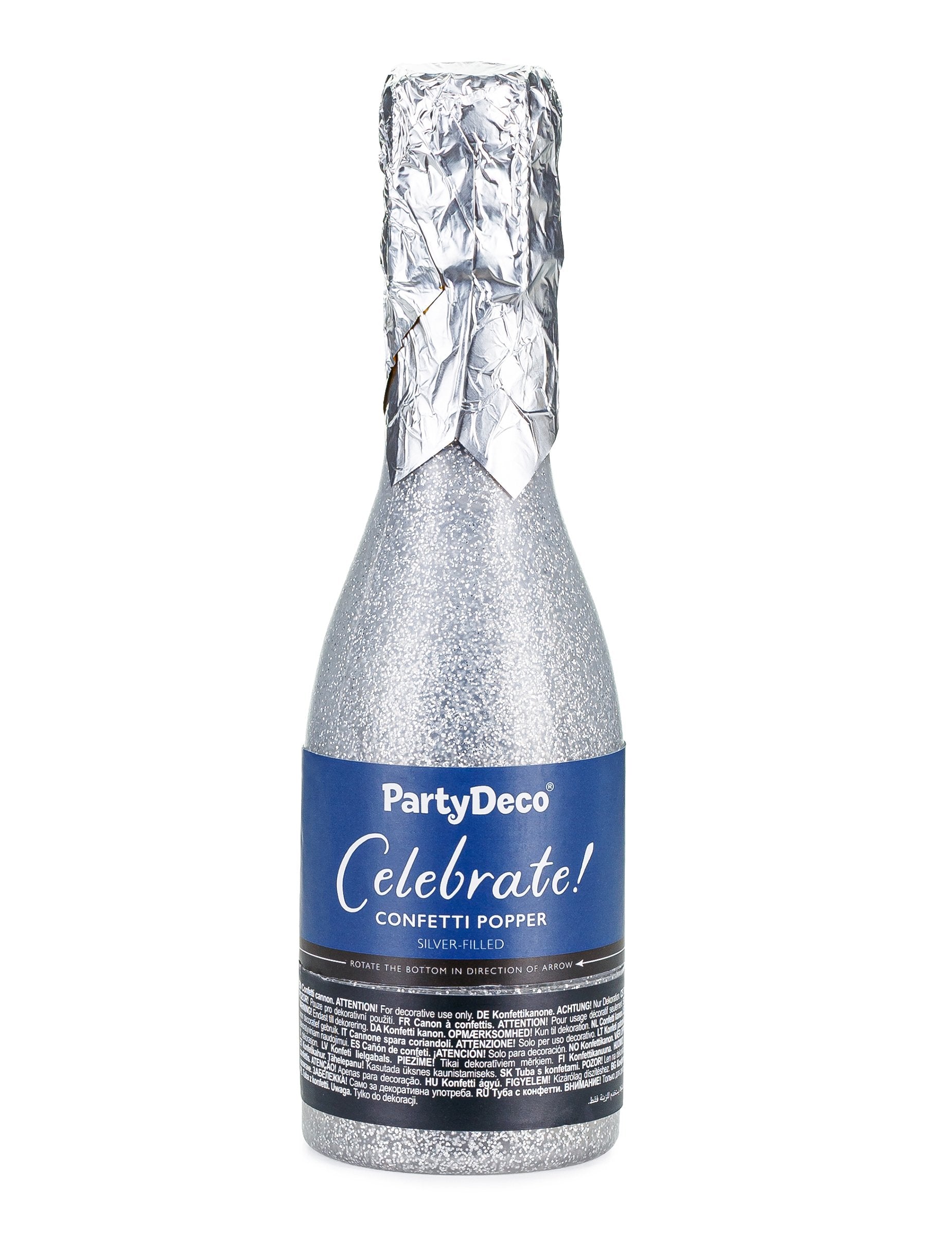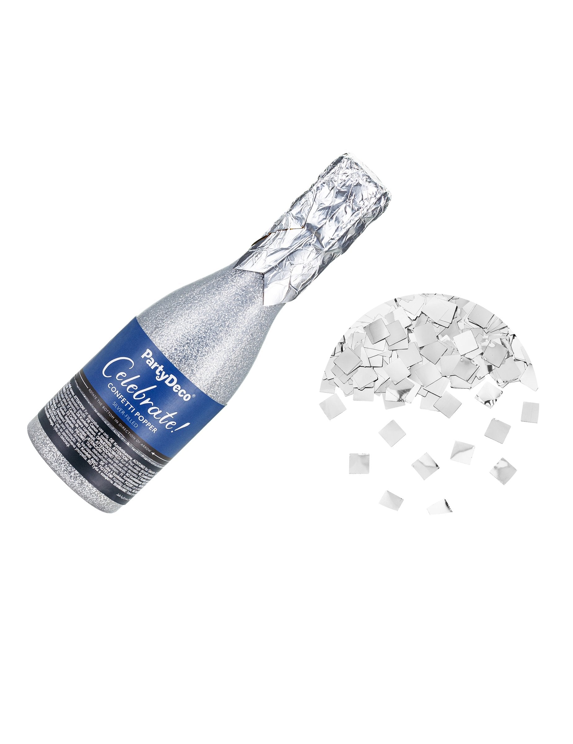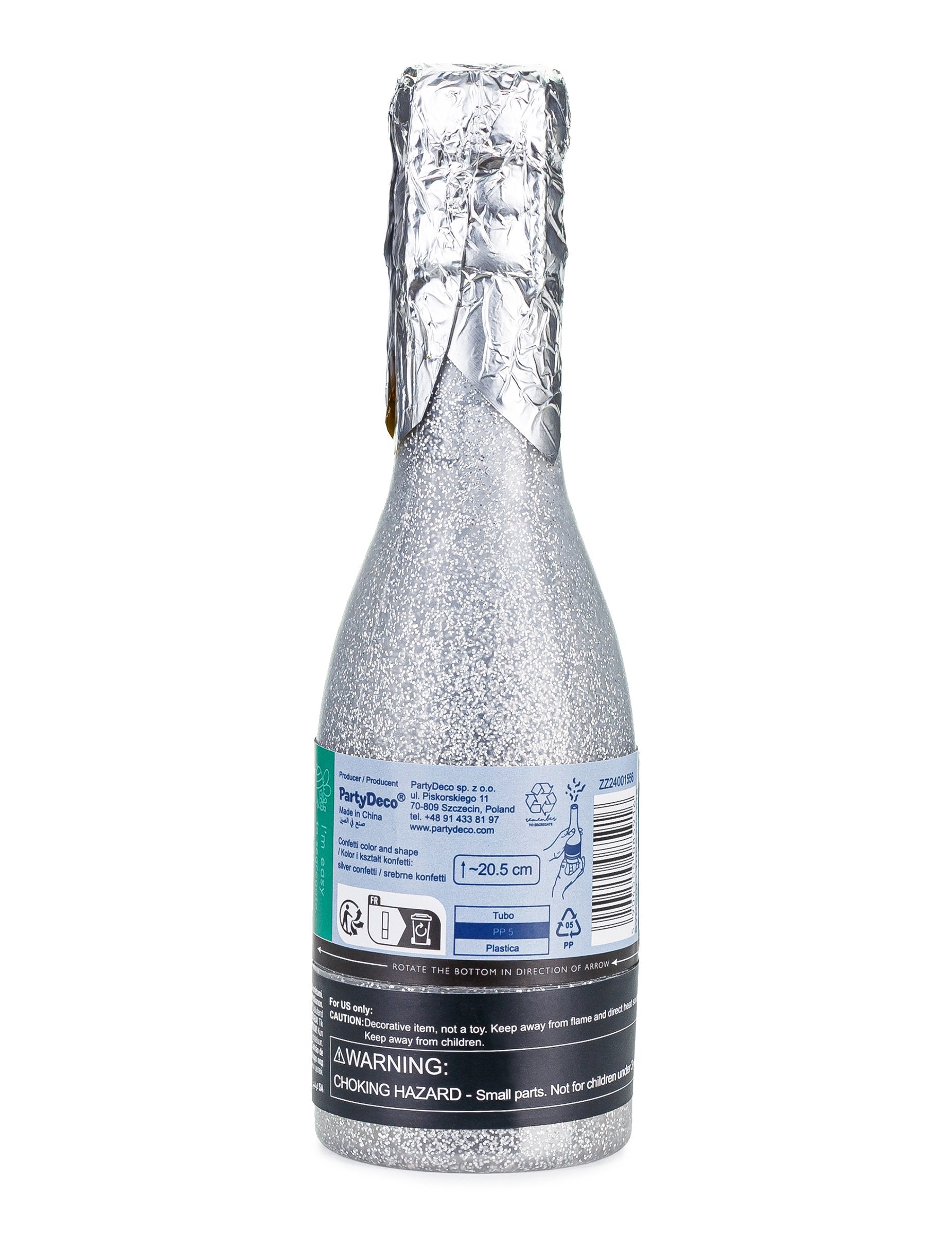 Този конфети-канонв сребристо е с форма на шампанско шише и изстрелва конфети от сребриста метализирана хартия.
