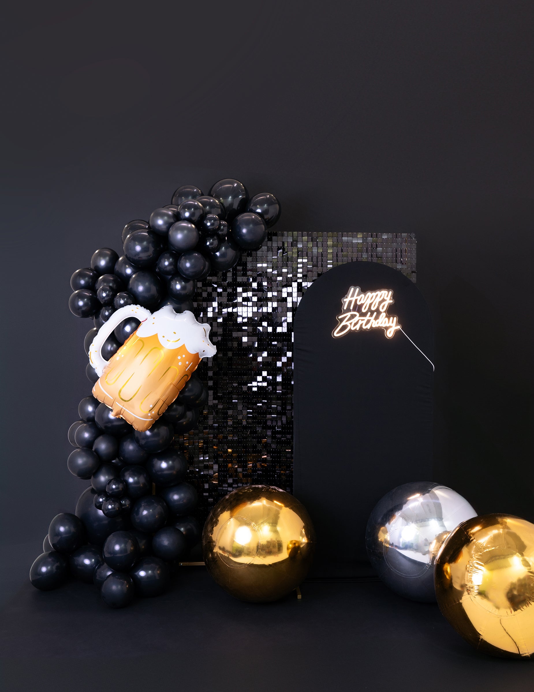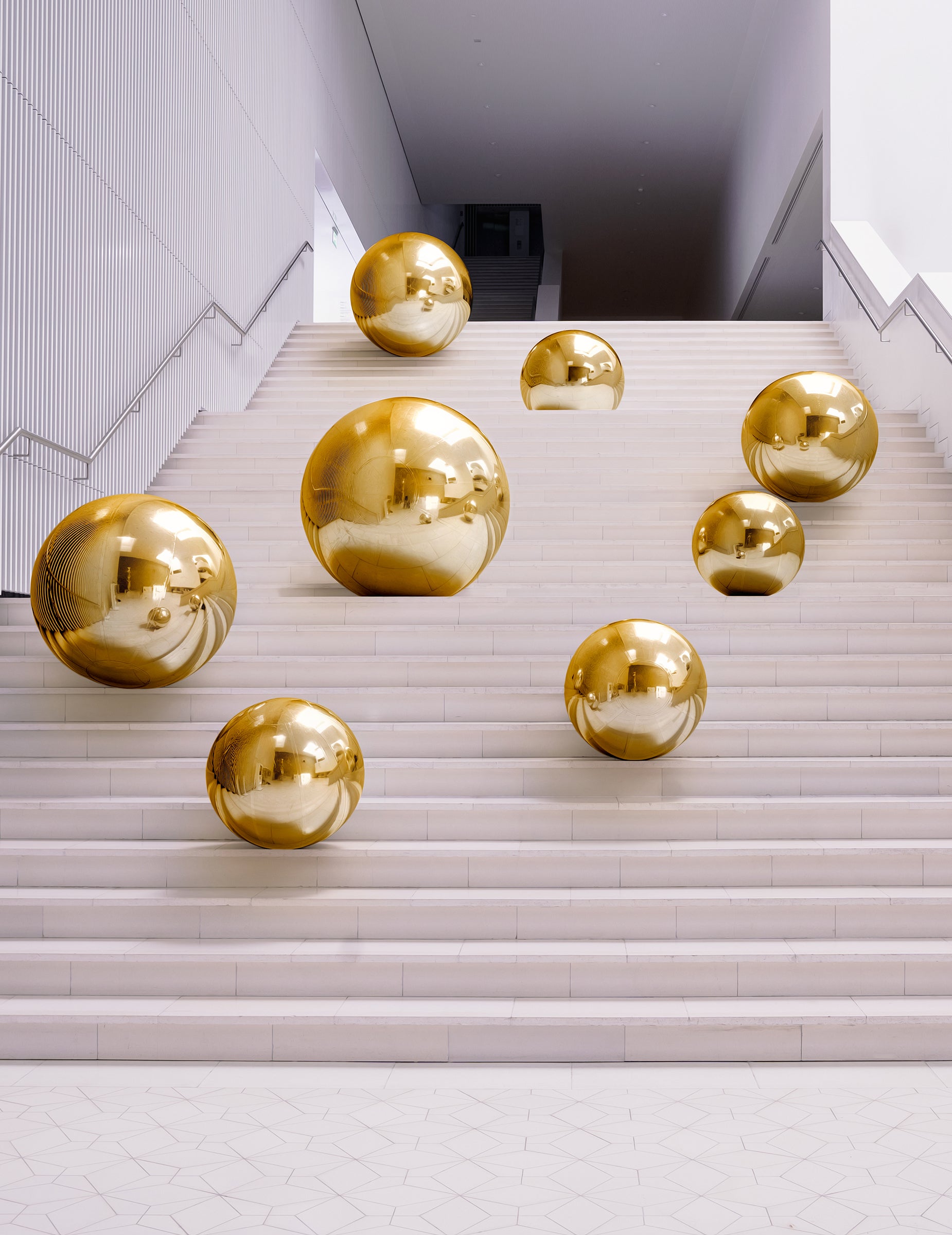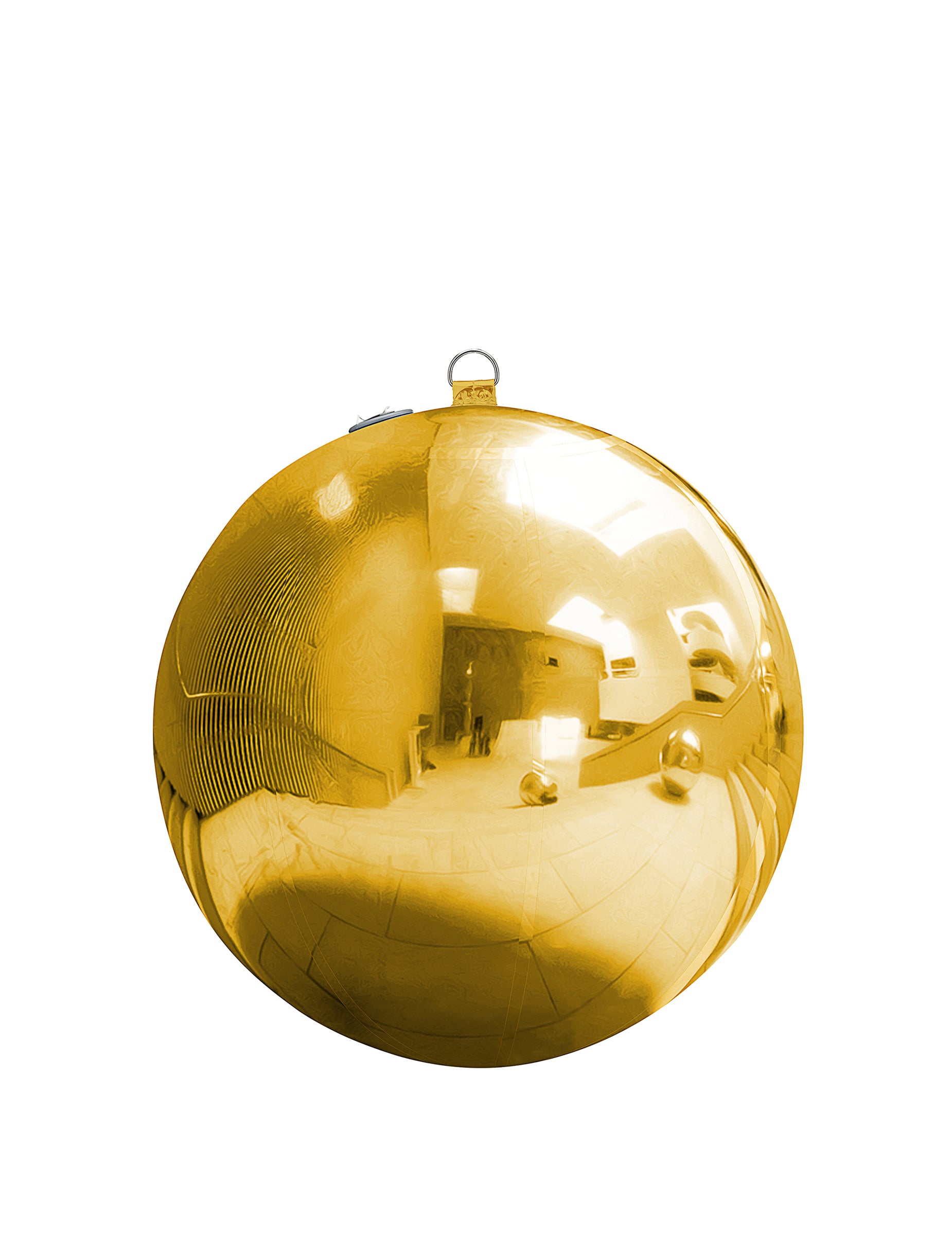 Тя има златна огледална повърхност, която отразява светлината и околните елементи. Сферичната ѝ форма и диаметърът от около 60 cm позволяват лесното ѝ интегриране в зала, приемно пространство или фото декор.