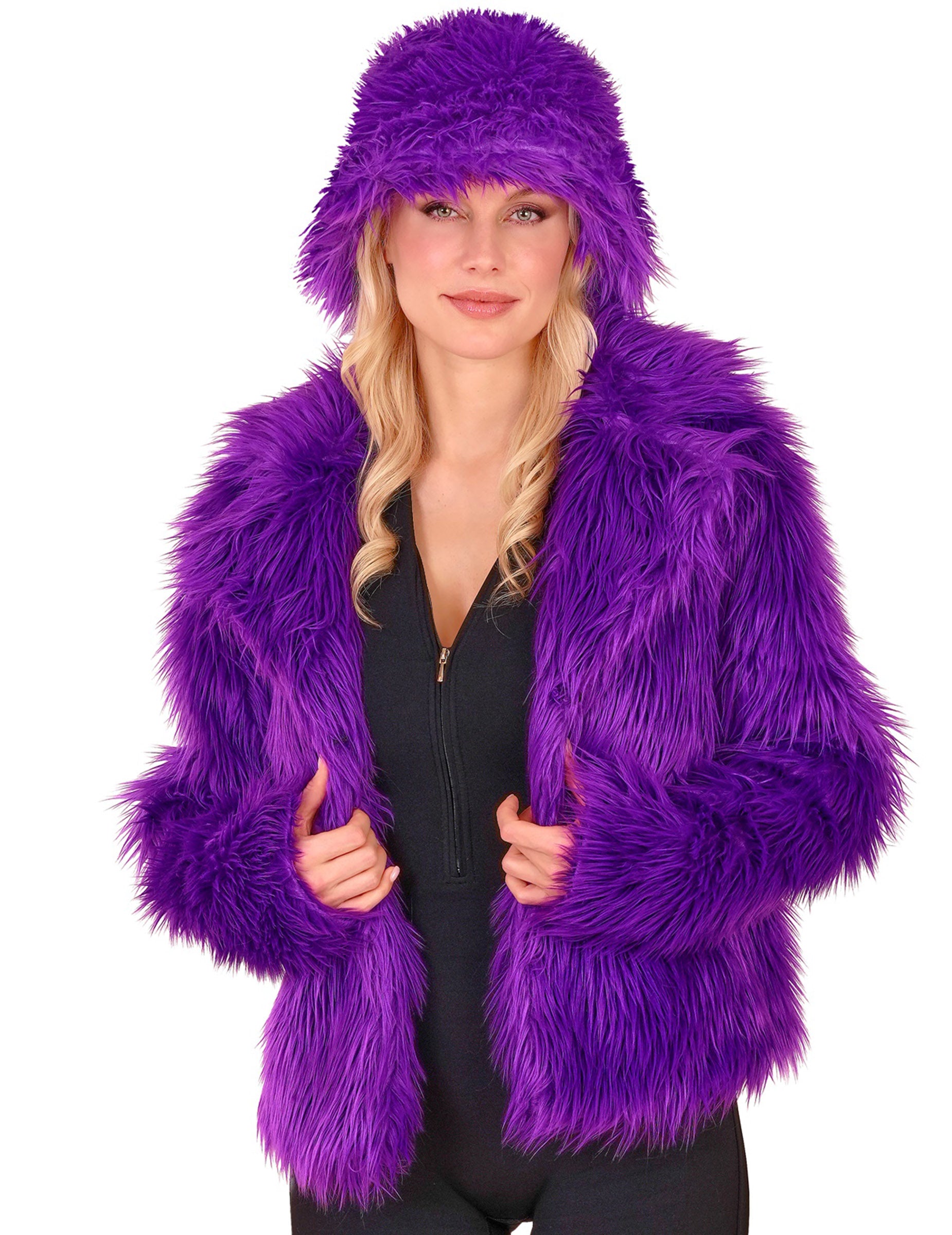 НА лилаво палто от изкуствена кожа Тази дреха за възрастни е с дълъг ръкав и е предназначена да допълни облекло за парти или костюм. Лилавият ѝ оттенък и изкуствената кожа създават мигновено разпознаваем визуален ефект.