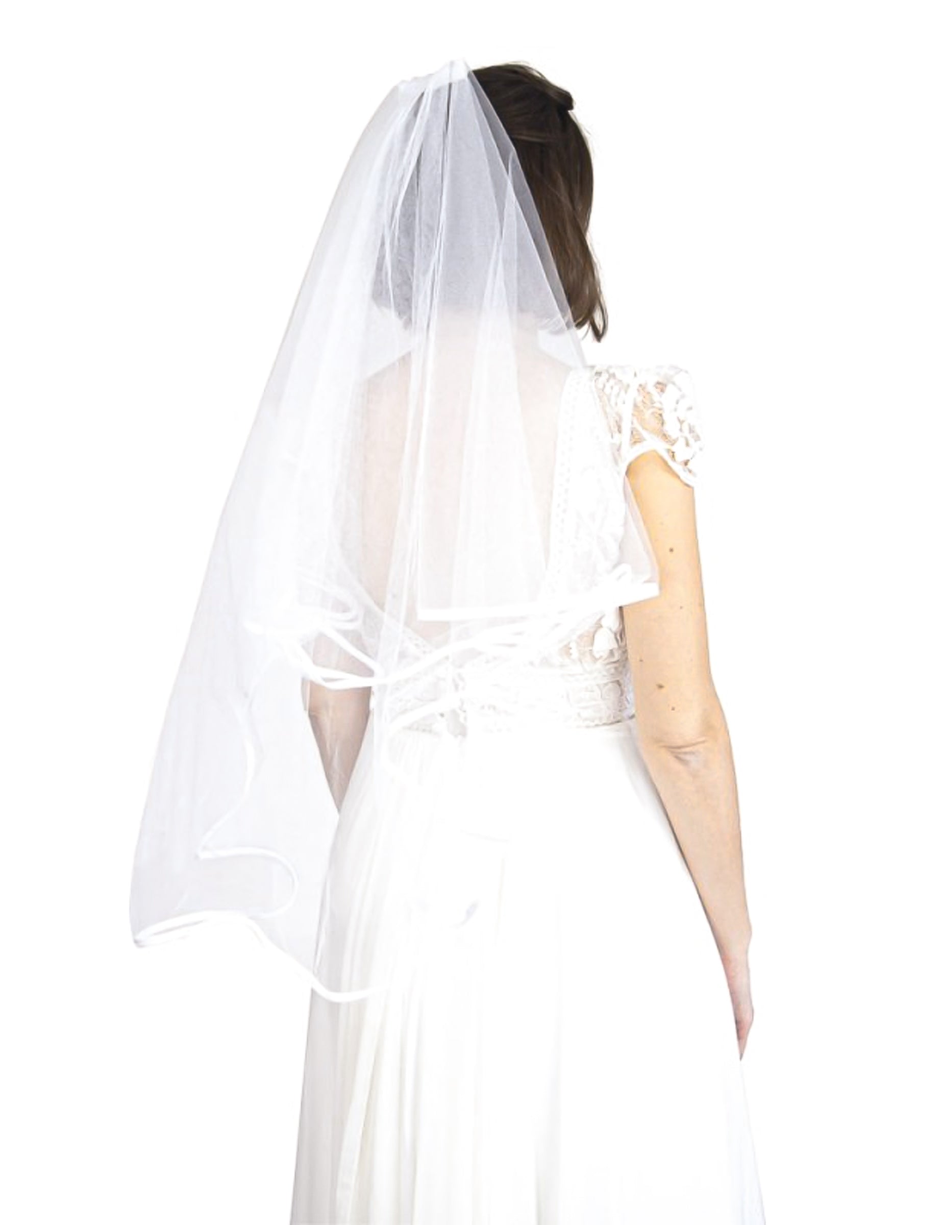Воалът е изработен от лека бяла материя, с видим сатенен кант по ръба, който деликатно подчертава формата му. Неговата плавна кройка пада естествено по гърба и допълва сватбена рокля или официално облекло с ненатрапчива елегантност.