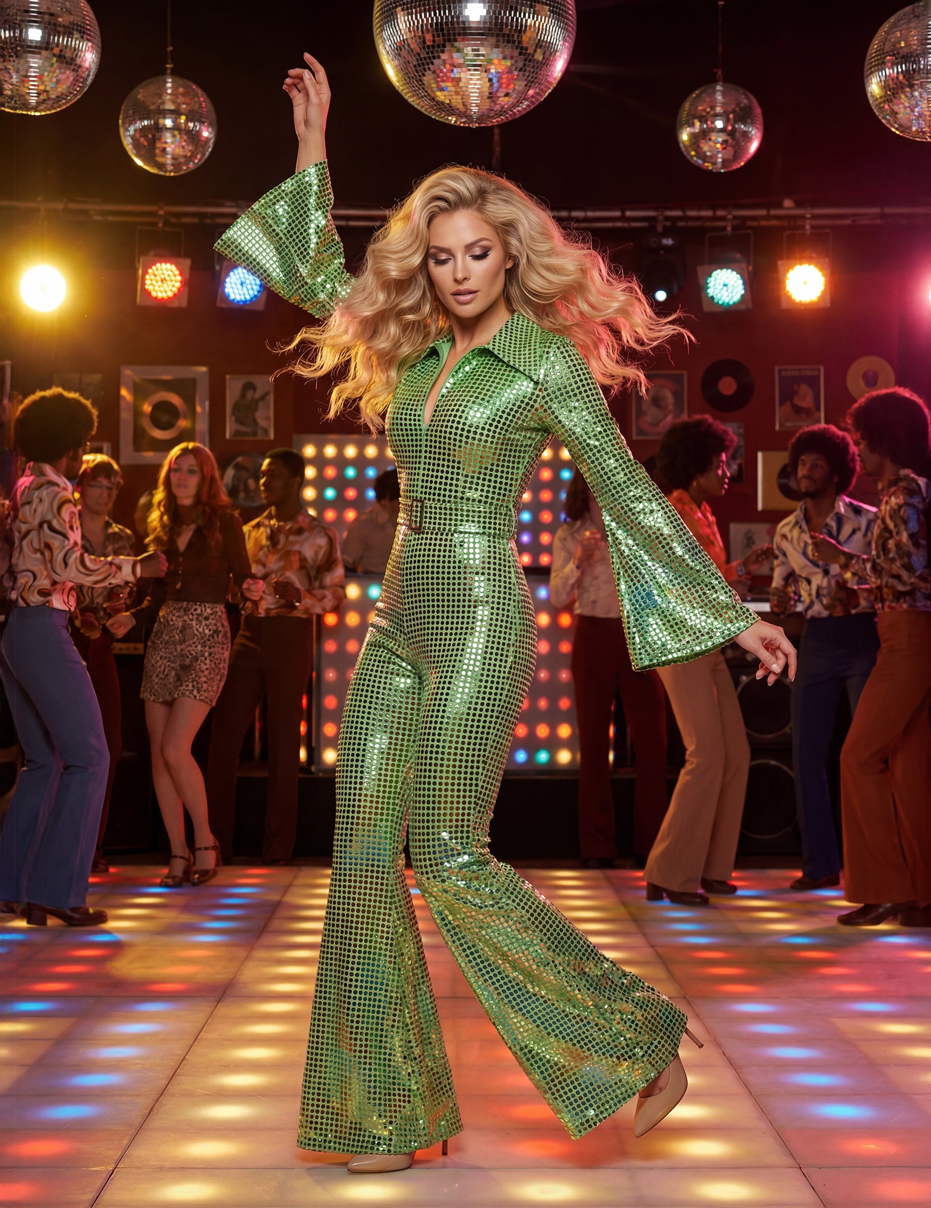 La combinaison disco verte pour femme trouve sa place lors du Carnaval, d’une soirée disco, d’une soirée années 70, d’un anniversaire ou d’une fête déguisée.