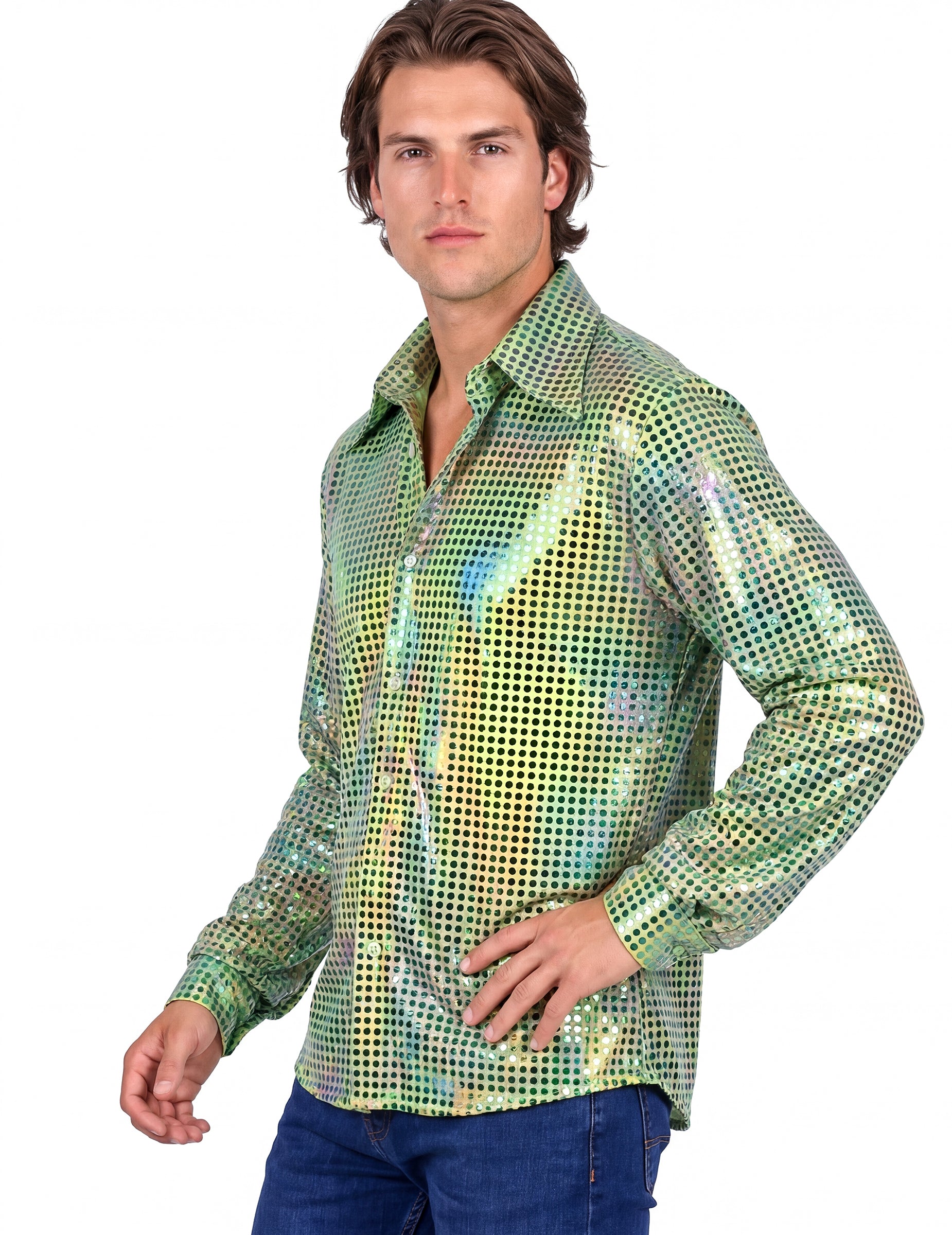La chemise présente un motif vert brillant réparti sur toute la surface, créant un effet lumineux visible selon l’éclairage. Sa coupe droite est associée à des manches longues et à un col ouvert, caractéristiques des tenues disco. Le tissu souple accompagne les mouvements et met en valeur la silhouette sur la piste de danse.