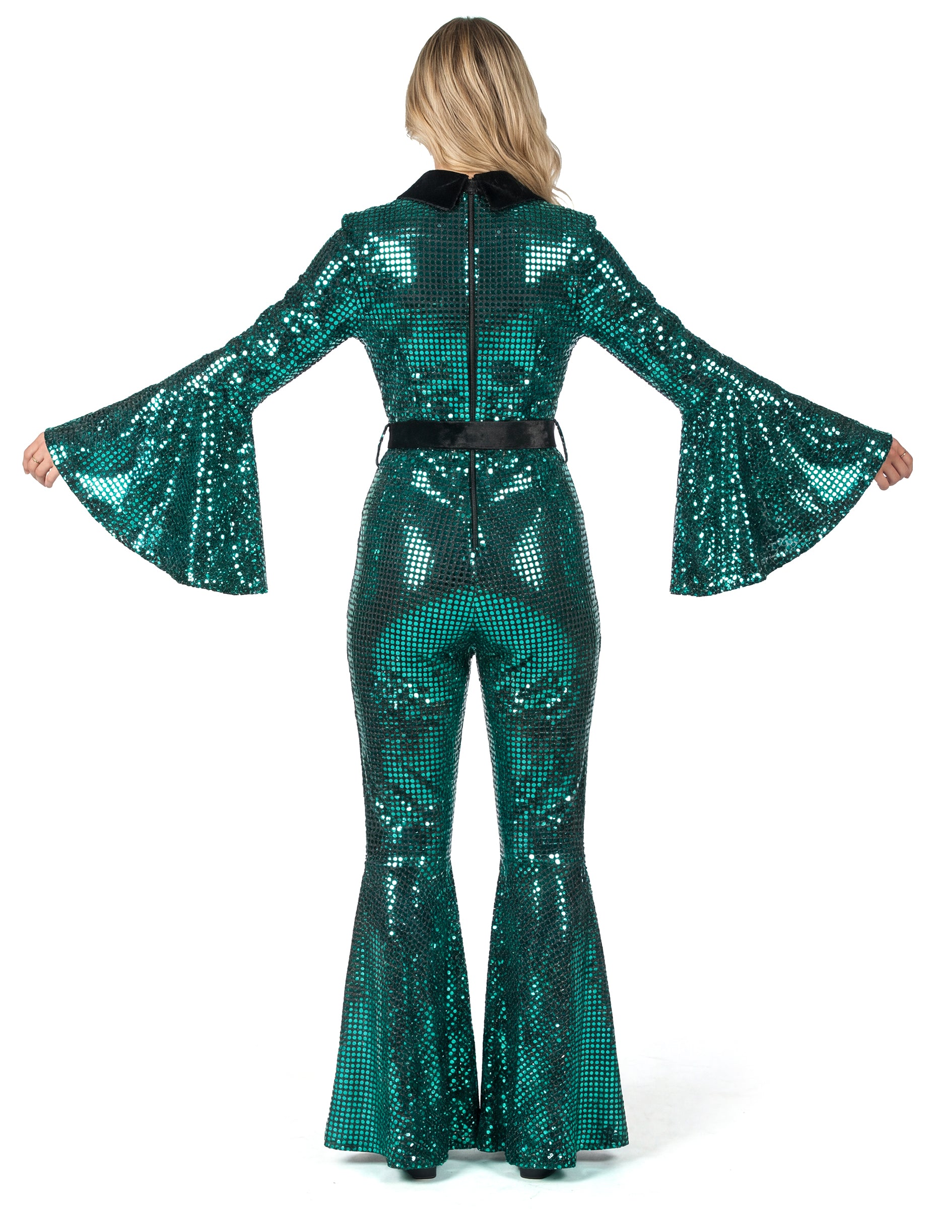 La combinaison disco turquoise avec ceinture pour femme est adaptée pour le Carnaval, une soirée disco, une soirée années 70, un anniversaire ou une fête déguisée.